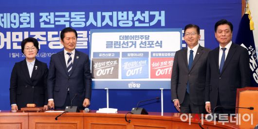 아시아투데이 송의주 기자 = 정청래 더불어민주당 대표가 16일 국회에서 열린 클린선거 선포식에서 퍼포먼스를 마치고 참석자들과 기념촬영을 하고 있다. 왼쪽부터 권향엽 공천신문고 단장, 정 대표, 이상식 클린선거 암행어사 단장, 조승래 지방선거기획단 단장. ⓒ "젊은 파워, 모바일 넘버원 아시아투데이"