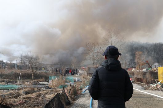 16일 서울 강남구 개포동 구룡마을 4지구 화재현장 소방 통제선 밖에서 주민이 현장을 지켜보고 있다. /연합뉴스 |