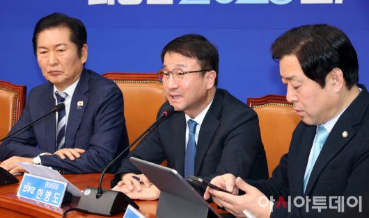 아시아투데이 송의주 기자 = 한병도 더불어민주당 원내대표가 16일 국회에서 열린 최고위원회의에서 발언을 하고 있다.