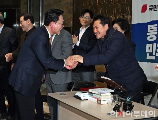 아시아투데이 송의주 기자 = 천하람 개혁신당 원내대표가 16일 국회에서 윤석열·김건희에 의한 내란·외환 및 국정농단 행위의 진상규명을 위한 특별검사 임명 등에 관한 법률안(2차 종합 특검)에 대한 무제한 토론(필리버스터)을 마친 후 단식 중인 장동혁 국민의힘 대표와 악수하고 있다.
