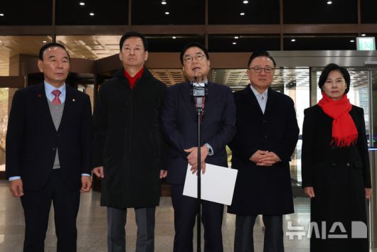 [서울=뉴시스] 배훈식 기자 = 서범수 국민의힘 의원이 16일 오전 서울 종로구 서울경찰청에서 민주당 김병기, 강선우, 김경 공천 뇌물 혐의 등에 대한 부실 수사를 항의하기 위해 서울경찰청장 면담에 앞서 취재진에게 발언하고 있다. 왼쪽부터 국민의힘 박덕흠, 최은석, 서 의원, 고동진, 서명옥 의원. 2026.01.16. dahora83@newsis.com |