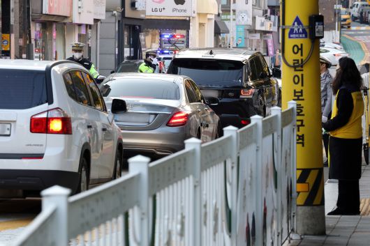 대대적인 교통단속이 실시된 서울 강남구 논현초등학교 인근 어린이보호구역에서 경찰이 음주운전 및 정지선 위반 차량을 단속하고 있다. [연합] |