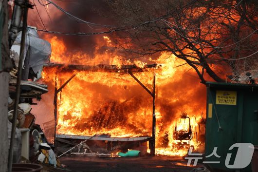 16일 오전 서울 강남구 개포동 구룡마을에서 발생한 화재로 불길이 치솟고 있다. 2026.1.16/뉴스1 ⓒ News1 김진환 기자 |