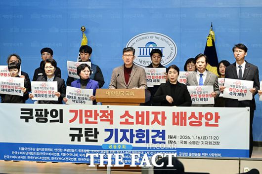[더팩트ㅣ국회=남용희 기자] 김남근 더불어민주당 의원(가운데)과 을지로위원회 쿠팡바로잡기TF 관계자들이 16일 오전 서울 여의도 국회 소통관에서 '쿠팡의 기만적 소비자 배상안 규탄 기자회견'을 열고 발언을 하고 있다.