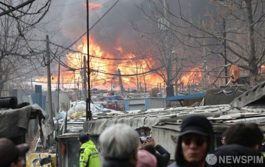 [서울=뉴스핌] 양윤모 기자 = 16일 오전 5시경 서울 강남구 개포동 구룡마을 4구역에서 화재가 발생해 소방 통제선 밖에서 주민들이 현장을 지켜보고 있다. 소방당국은 대응 1단계를 2단계로 격상하고 추가 인력을 투입 진화를 완료했다. 2026.01.16 yym58@newspim.com