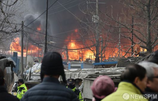 [서울=뉴스핌] 양윤모 기자 = 16일 오전 5시경 서울 강남구 개포동 구룡마을 4구역에서 화재가 발생해 소방 통제선 밖에서 주민들이 현장을 지켜보고 있다. 소방당국은 대응 1단계를 2단계로 격상하고 추가 인력을 투입 진화를 완료했다. 2026.01.16 yym58@newspim.com