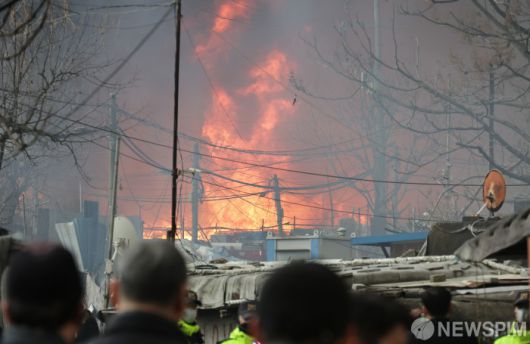 [서울=뉴스핌] 양윤모 기자 = 16일 오전 5시경 서울 강남구 개포동 구룡마을 4구역에서 화재가 발생해 소방 통제선 밖에서 주민들이 현장을 지켜보고 있다. 소방당국은 대응 1단계를 2단계로 격상하고 추가 인력을 투입 진화를 완료했다. 2026.01.16 yym58@newspim.com |