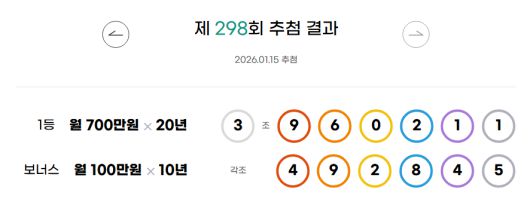 2026년 1월 15일 진행된 제298회 연금복권 720+ 1등 당첨번호는 3조 9 6 02 1 1이다. 보너스 번호는 각조 4 9 2 8 4 5다.