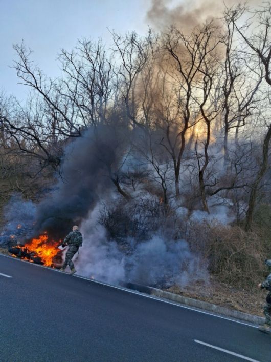 ▲1해병사단 해안감시기동대 소속 김현준 상사가 지난 15일 포항시 남구 장기면 야산에서 오토바이 사고로 발생한 화재를 진압하고 있다. ⓒ포항남부소방서 제공 |