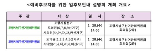 설명회는 이달 28일 오후 2시, 포항시 남·북구선거관리위원회 대회의실에서 각각 열린다.