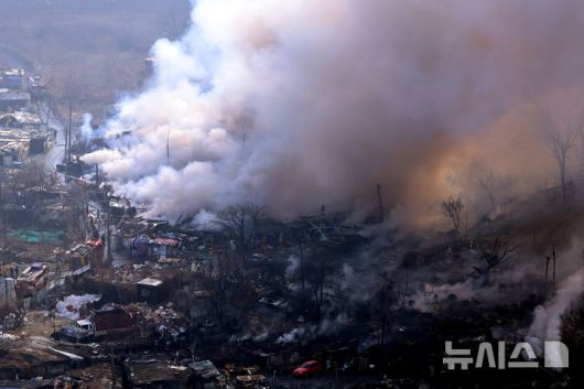 [서울=뉴시스] 최진석 기자 = 16일 화재가 발생한 서울 개포동 구룡마을에서 연기가 피어 오르고 있다. 2026.01.16. myjs@newsis.com |