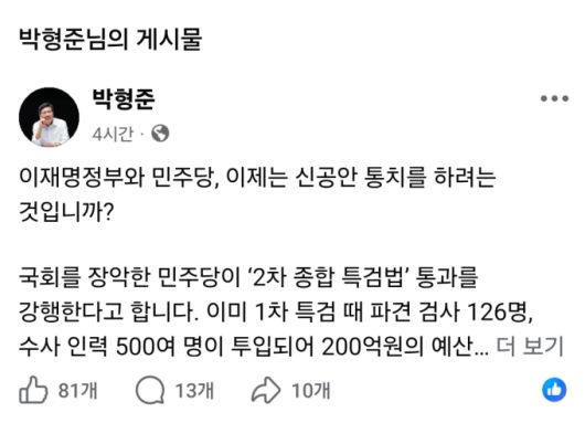 그는 "이미 1차 특검 때 200억 원을 들여 6개월간 수사를 진행했는데, 사실상 같은 특검을 또다시 무리하게 추진하고 있다"고 직격했다.