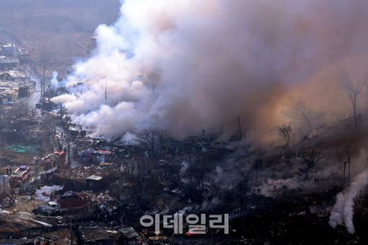 16일 화재가 발생한 서울 개포동 구룡마을에서 연기가 피어 오르고 있다.(사진=뉴시스) |
