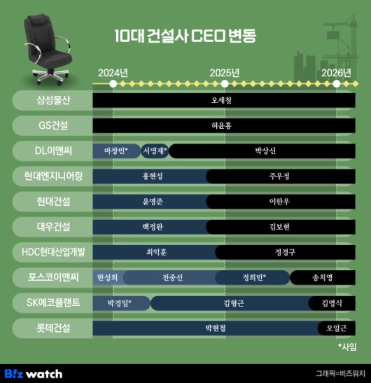 지난해 초, 국토교통부 시공능력평가 상위 10개 건설사(삼성물산·현대건설·대우건설·DL이앤씨·GS건설·현대엔지니어링·포스코이앤씨·롯데건설·SK에코플랜트·HDC현대산업개발) 중 절반인 5곳이 CEO를 새로 선임했습니다.