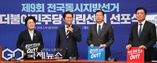 (서울=국제뉴스) 정청래 더불어민주당 대표가 16일 서울 여의도 국회에서 열린 제9회 전국동시지방선거 더불어민주당 클린선거 선포식에서 인사말을 하고 있다. 왼쪽부터 권향엽 공천신문고 단장, 정 대표, 이상식 암행어사단장, 조승래 사무총장./사진=이용우 기자