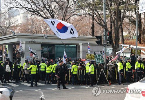 (서울=연합뉴스) 한종찬 기자 = 윤석열 전 대통령의 특수공무집행방해, 범인도피교사, 직권남용 권리행사방해 혐의 사건 1심 선고가 열린 16일 서울 서초구 서울중앙지방법원 앞에서 윤석열 전 대통령 지지자들이 구호를 외치고 있다 2026.1.16