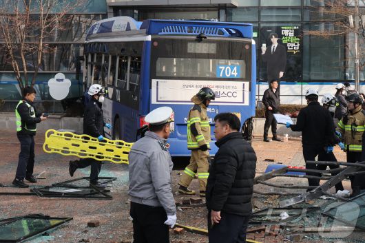 (서울=뉴스1) 황기선 기자 = 16일 오후 서울 중구 NH농협은행 본점영업부를 시내버스가 들이받는 사고가 발생해 경찰과 소방당국이 이를 수습하고 있다. 2026.1.16/뉴스1