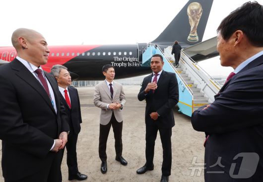 (서울=뉴스1) 공항사진기자단 = FIFA 전설적 인물인 전 브라질 축구 국가대표 선수 지우베르투 시우바가 'FIFA 월드컵™ 트로피 투어 by 코카-콜라' 일정으로 방한해 차범근 전 감독, 이영표 해설위원 등과 대화하고 있다. 왼쪽부터 차두리 감독, 이준엽 한국 코카콜라 대표, 이영표 해설위원, 지우베르투 시우바 전 브라질 축구 국가대표 선수, 차범근 전 감독. 2026.1.16/뉴스1