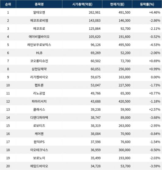 시가총액 상위 종목들은 다양한 등락폭을 보이며 혼조세를 나타내고 있다. 특히 레인보우로보틱스는 4.53% 하락하며 가장 큰 폭의 등락을 기록하고 있으며, 알테오젠은 4.46% 상승으로 강세를 보이고 있다. 이러한 등락에도 불구하고, 일부 종목들은 안정적인 재무 지표를 유지하고 있다.