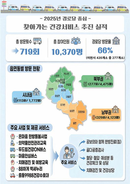 이천시에 따르면 분석 결과 지난해 경로당 277개소를 총 719회 순회해 1만370명의 어르신에게 한방진료, 골밀도 측정, 건강상담, 치매검진, 운동교실 등 다양한 건강관리서비스를 제공했는데 이는 이천시 전체 경로당의 66%(277개소)에 달하는 수치다.