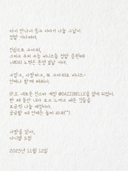 다니엘은 16일 자신의 새 SNS 계정을 통해 “전하지 못한 편지”라는 제목의 장문 글을 게재했다. 지난해 11월 12일 작성된 뉴진스 팬덤 버니즈에게 보내는 편지 형식이다.