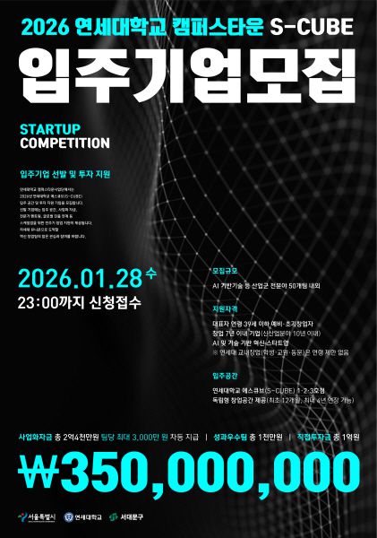 연세대 창업지원단 관계자는 “에스큐브 입주기업으로 선정되면 업무 공간부터 사업화 자금, 투자 지원, 창업교육, 전문가 멘토링, 글로벌 네트워킹까지 실질적인 성장 지원을 받을 수 있다”며, “혁신 아이디어와 기술을 가진 예비창업자와 초기 스타트업의 적극적인 참여를 기대한다”고 말했다.