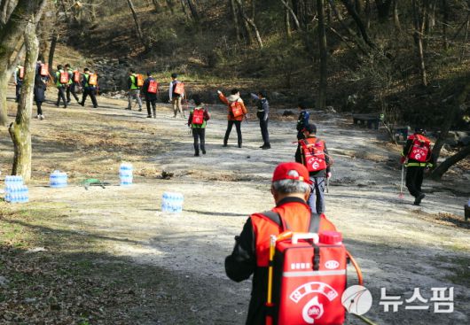 성남시 산불진화대가 분당구 불곡산 산불 현장에 등짐펌프를 메고 도보로 진입하고 있다.[사진=뉴스핌DB] |