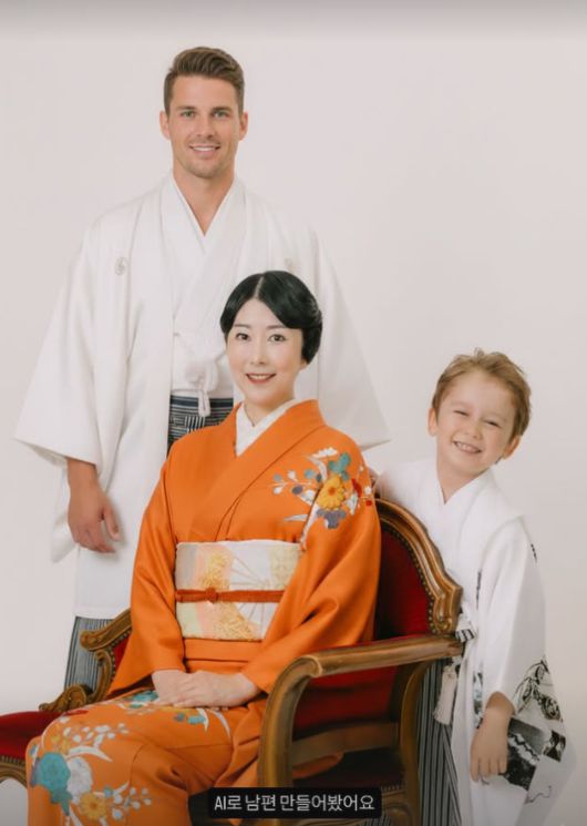 공개된 사진 속 사유리는 전통 기모노를 입고 아들 젠과 함께 환하게 웃고 있으며, 그 옆에는 서로 다른 외모의 두 남성이 각각 남편으로 합성돼 서 있다.