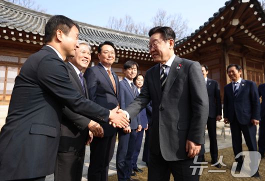 (서울=뉴스1) 허경 기자 = 이재명 대통령이 16일 청와대 상춘재에서 열린 정당 지도부 초청 오찬에서 한병도 더불어민주당 원내대표와 악수를 나누고 있다. (청와대통신사진기자단) 2026.1.16/뉴스1seiyu@news1.krCopyright ⓒ 뉴스1. All rights reserved. 무단 전재 및 재배포, AI학습 이용 금지.