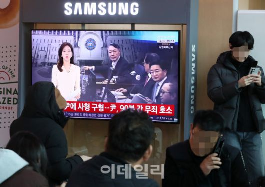 [이데일리 김태형 기자] 14일 오전 서울 중구 서울역 대합실에서 시민들이 윤석열 전 대통령 사형 구형에 관한 뉴스를 시청하고 있다.