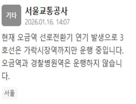 서울교통공사는 16일 오후 2시 7분께 "현재 오금역 선로전환기 연기 발생으로 3호선은 가락시장역까지만 운행 중이다"라는 내용의 재난문자를 발송했다.