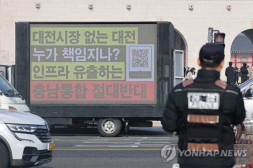 (서울=연합뉴스) 서대연 기자 = 16일 서울 종로구 광화문 앞에서 대전·충남 행정 통합을 반대하는 트럭 시위가 열리고 있다. 2026.1.16 dwise@yna.co.kr ▶제보는 카카오톡 okjebo▶연합뉴스 앱 지금 바로 다운받기~▶네이버 연합뉴스 채널 구독하기 <저작권자(c) 연합뉴스, 무단 전재-재배포, AI 학습 및 활용 금지><저작권자(c)연합뉴스. 무단전재-재배포금지.>