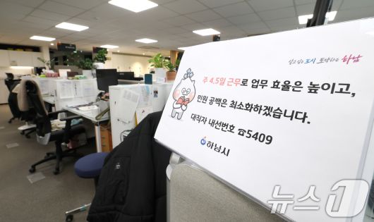 (하남=뉴스1) 김영운 기자 = 경기 하남시가 수도권 지자체 중 처음으로 4.5일 근무제 도입해 본격적으로 시행한 16일 경기 하남시청의 한 사무실 자리에 4.5일근무제로 퇴근을 알리는 안내문이 게시되어 있다. 하남시의 4.5일제는 유연근무제 중 '근무시간선택형'을 활용해 월요일부터 목요일까지 추가 근무를 한 뒤 금요일 13시 조기 퇴근을 하는 방식으로 운영되며 의견 수렴 및 수요조사를 거쳐 이날부터 본격적으로 시행했다. 2026.1.16/뉴스1
