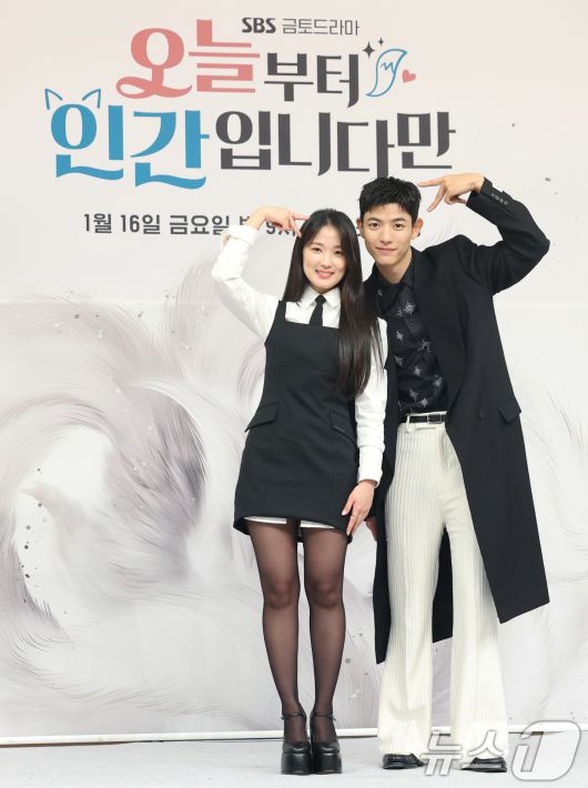 (서울=뉴스1) 권현진 기자 = 배우 김혜윤과 로몬(오른쪽)이 16일 서울 양천고 목동SBS에서 열린 새 금토드라마 '오늘부터 인간입니다만'(극본 박찬영, 조아영/ 연출 김정권) 제작발표회에 참석해 포즈를 취하고 있다. ‘오늘부터 인간입니다’는 하루아침에 인간이 된 구미호 은호(김혜윤 분)와 세계 최정상에서 추락한 축구선수 강시열(로몬 분)의 '운명 격변'이 담긴 망생구원 판타지 로맨스다. 2026.1.16/뉴스1