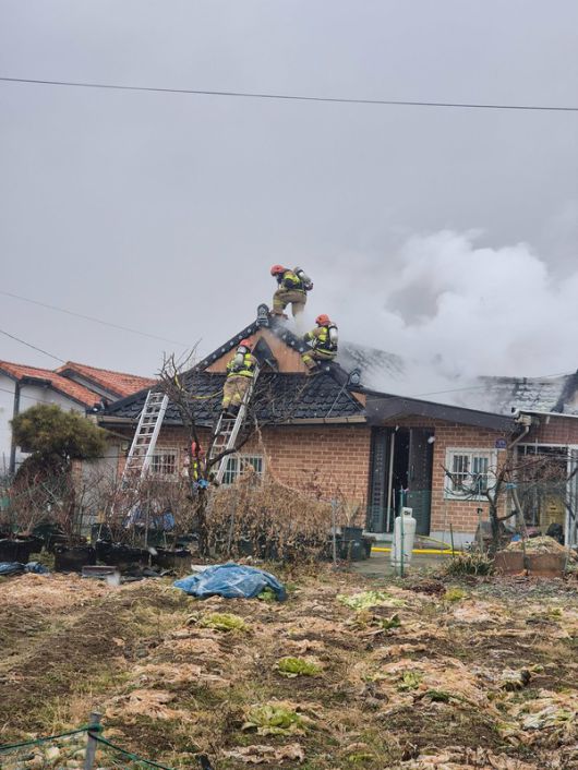 주택 화재 현장에서 소방대원들이 지붕위에서 화재 진압을 벌이고 있다. (사진제공=예산소방서) |
