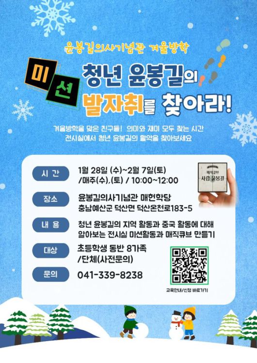 기념관 관계자는"겨울방학을 맞아 가족이 함께 윤봉길 의사의 삶과 정신을 자연스럽게 체험하고 우리 역사를 친숙하게 접하는 시간이 되길 바란다"고 말했다.