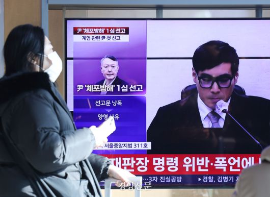 윤석열 전 대통령의 ‘체포 방해’ 관련 사건 1심 선고 공판이 서울중앙지법에서 열린 16일 서울역 대합실에서 시민들이 생중계로 진행되는 재판을 시청하고 있다. 성동훈 기자 |