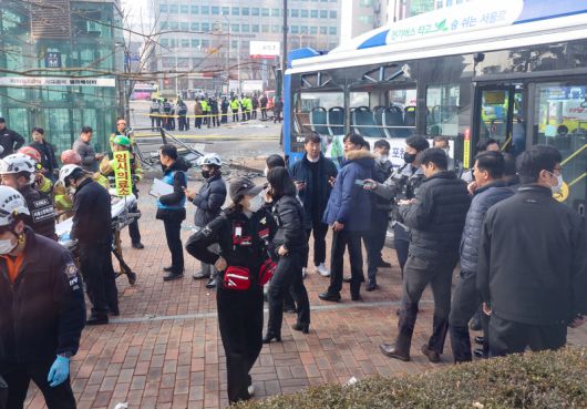 | 서울 서대문역 사거리에서 버스가 인도로 돌진 뒤 건물에 충돌해 경찰과 소방대원들이 현장을 수습하고 있다. 2026.1.16 / 사진=연합뉴스 |