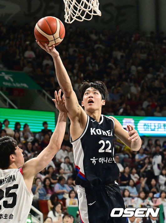 [OSEN=안양, 김성락 기자] 13일 오후 안양 정관장아레나에서 ‘하나은행 2025 남자농구 국가대표 평가전’ 대한민국과 일본의 두 번째 평가전이 열렸다. 대한민국은 지난 11일 열린 일본과의 첫 번째 평가전에서 91-77로 승리를 거뒀다. 3쿼터 대한민국 여준석이 골밑슛을 하고 있다. 2025.07.13 / ksl0919@osen.co.kr |
