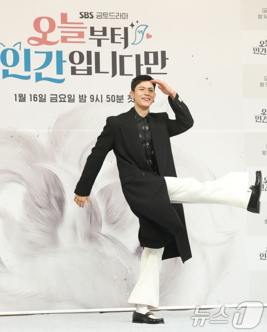 (서울=뉴스1) 권현진 기자 = 배우 로몬이 16일 서울 양천고 목동SBS에서 열린 새 금토드라마 '오늘부터 인간입니다만'(극본 박찬영, 조아영/ 연출 김정권) 제작발표회에 참석해 골 세리머니 포즈를 취하고 있다. ‘오늘부터 인간입니다’는 하루아침에 인간이 된 구미호 은호(김혜윤 분)와 세계 최정상에서 추락한 축구선수 강시열(로몬 분)의 '운명 격변'이 담긴 망생구원 판타지 로맨스다. 2026.1.16/뉴스1