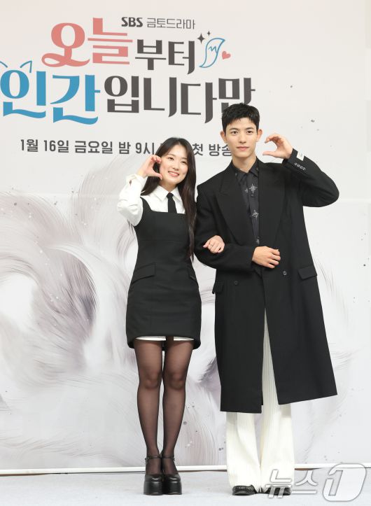 (서울=뉴스1) 권현진 기자 = 배우 김혜윤과 로몬(오른쪽)이 16일 서울 양천고 목동SBS에서 열린 새 금토드라마 '오늘부터 인간입니다만'(극본 박찬영, 조아영/ 연출 김정권) 제작발표회에 참석해 포즈를 취하고 있다. ‘오늘부터 인간입니다’는 하루아침에 인간이 된 구미호 은호(김혜윤 분)와 세계 최정상에서 추락한 축구선수 강시열(로몬 분)의 '운명 격변'이 담긴 망생구원 판타지 로맨스다. 2026.1.16/뉴스1