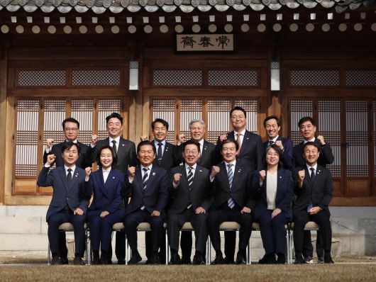 | 이재명 대통령이 16일 청와대 상춘재에서 열린 정당 지도부 초청 오찬에서 참석자들과 기념촬영하고 있다. / 사진=연합뉴스 |