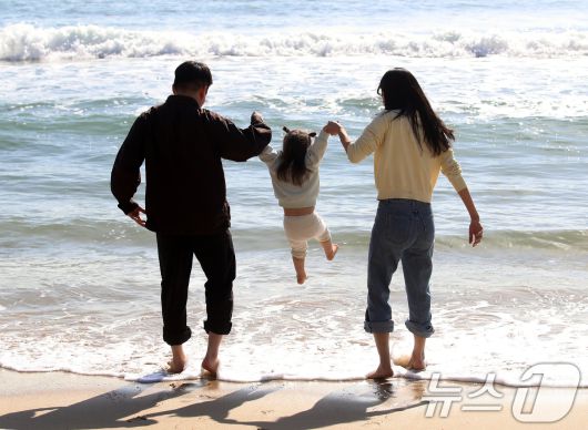 포근한 날씨를 보인 16일 부산 해운대해수욕장에서 가벼운 복장 차림을 한 가족이 바닷물에 발을 담그며 즐거운 시간을 보내고 있다. 2026.1.16/뉴스1 ⓒ News1 윤일지 기자 |