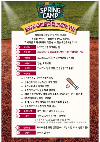 (엑스포츠뉴스 김유민 기자) LG 트윈스가 2026 오키나와 전지훈련 참관단을 모집한다. 모집 인원은 LG 팬 60명이며, 접수는 오는 19일 오전 11시부터 21일 오전 11까지 선착순으로 진행된다.