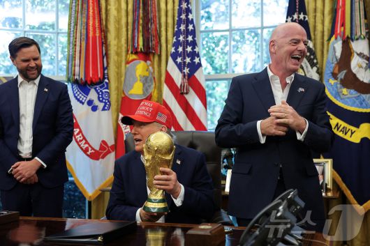 도널드 트럼프 미국 대통령이 8월 22일(현지시간) 워싱턴DC 백악관 집무실에서 '트럼프가 전부 옳았다!'(Trump Was Right About Everything!)라고 적힌 모자를 쓴 채 FIFA 월드컵 트로피를 들고 2026년 FIFA 월드컵 관련 발표를 하고 있다. 2025.08.22. ⓒ 로이터=뉴스1 ⓒ News1 윤다정 기자 |