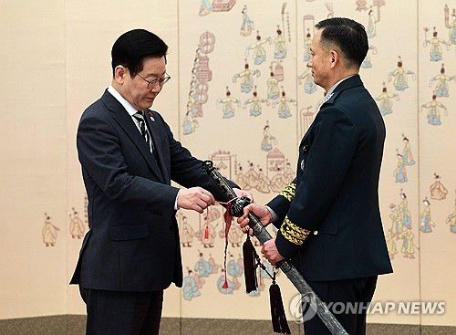 (서울=연합뉴스) 김도훈 기자 = 이재명 대통령이 16일 청와대 본관에서 열린 3성 장군 진급·보직 신고 및 수치 수여식에서 최장식 육군참모차장의 삼정검에 수치를 달아주고 있다. 2026.1.16