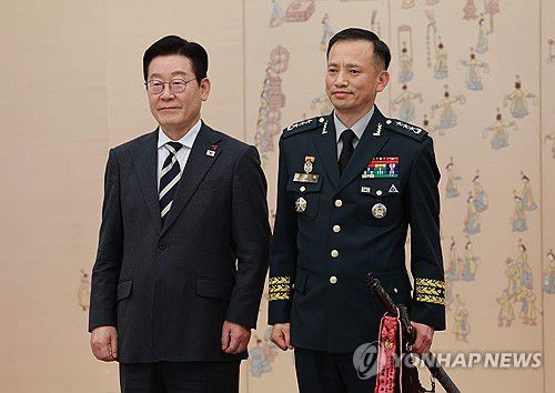 (서울=연합뉴스) 김도훈 기자 = 이재명 대통령이 16일 청와대 본관에서 열린 3성 장군 진급·보직 신고 및 수치 수여식에서 최장식 육군참모차장과 기념촬영을 하고 있다. 2026.1.16