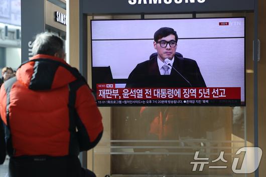 (서울=뉴스1) 이광호 기자 = 16일 오후 서울역에서 시민들이 체포 방해와 국무위원 심의권 침해 등 혐의로 기소된 윤석열 전 대통령에 대한 1심 선고 생중계를 지켜보고 있다. 서울 서초구 중앙지방법원에서 열린 1심 선고에서 백대현 부장판사가 판결문을 낭독한 뒤 징역 5년을 선고하는 모습. 2026.1.16/뉴스1