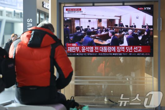 (서울=뉴스1) 이광호 기자 = 16일 오후 서울역에서 시민들이 체포 방해와 국무위원 심의권 침해 등 혐의로 기소된 윤석열 전 대통령에 대한 1심 선고 생중계를 지켜보고 있다. 서울 서초구 중앙지방법원에서 열린 1심 선고에서 백대현 부장판사가 판결문을 낭독한 뒤 징역 5년을 선고하는 모습. 2026.1.16/뉴스1