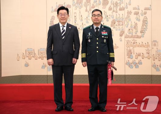(서울=뉴스1) 허경 기자 = 이재명 대통령이 16일 청와대 본관에서 열린 3성 장군 진급·보직 신고 및 수치 수여식에서 박춘식 육군군수사령관과 기념촬영을 하고 있다. 2026.1.16/뉴스1seiyu@news1.krCopyright ⓒ 뉴스1. All rights reserved. 무단 전재 및 재배포, AI학습 이용 금지.